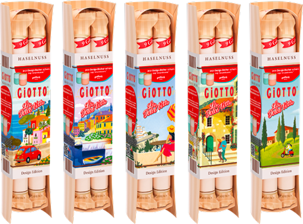 Es nehmen alle Giotto Aktionspackungen in der „La Dolce Vita“ Designedition x Potluck teil (36 Stück/154 Gramm).