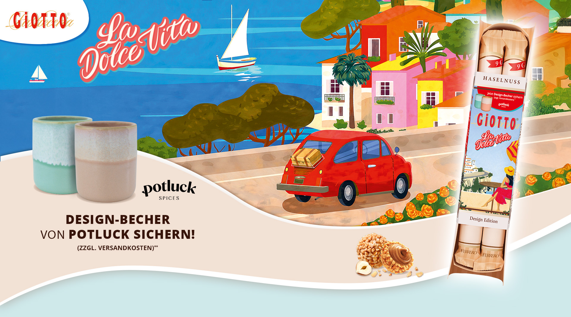 Mit dem Kauf einer Giotto Aktionspackung (36 Stück/154 Gramm) in der „La Dolce Vita“ Designedition x Potluck und der Teilnahme auf der Aktionswebsite https://www.giotto.de/potluck.de, erhält der Teilnehmer einen Gutschein-Code per E-Mail, den er im Potluck-Onlineshop https://www.potluck.de/l/giotto für einen von zwei Design-Bechern gegen die Zahlung von Versandkosten in Höhe von 4,50€ einlösen kann.